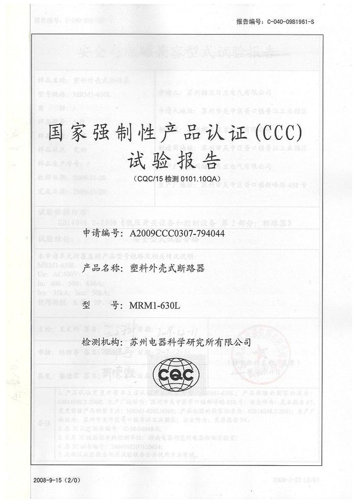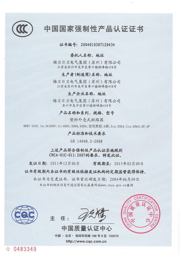 MRM1-630L塑殼短路器資質(zhì)證書