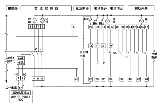 斷路器總體接線端子共有47個(gè),接線簡(jiǎn)單、便于用戶使用