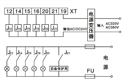 二次接線如圖所示[直流電源DC110V或220V從U1(+)、U2(-)輸入,直流電源模塊兩輸出端分別相應(yīng)與二次接線