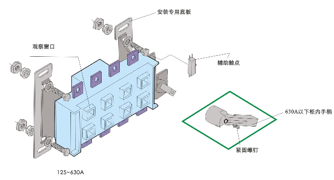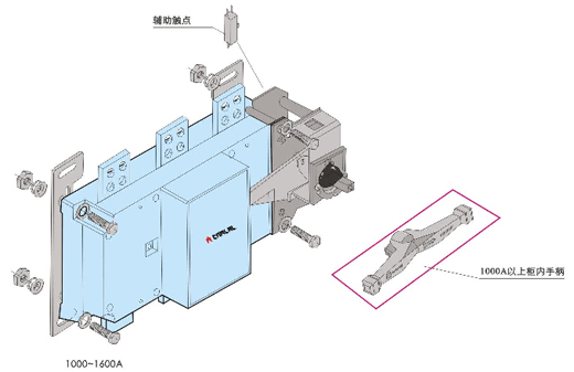 柜內(nèi)操作;手柄安裝在開(kāi)關(guān)右側(cè)。