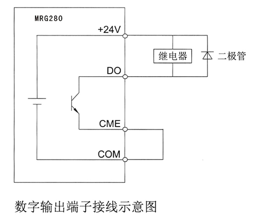 注2:數(shù)字輸出地CME與數(shù)字輸入地COM是內(nèi)部隔離的,但出廠時CME與COM已經(jīng)外部短接(此時D01默認(rèn)為+24V驅(qū)動)。當(dāng)D01想用外部電源驅(qū)動時,必須斷開CME與COM的外部短接。