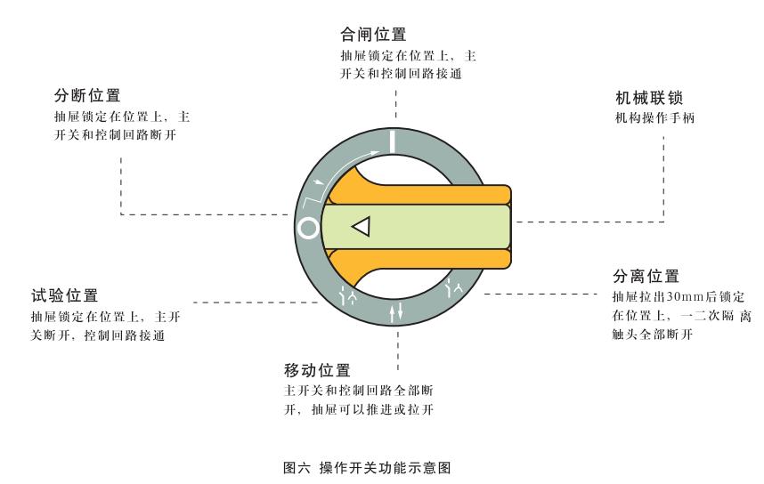 抽屜插入后,將手柄順時(shí)針方向轉(zhuǎn)動(dòng)時(shí),首先到達(dá)“試驗(yàn)位置”(↓),此時(shí)機(jī)構(gòu)將外部電源引入控制回路,用戶通過面板上的安全電器(假如有的話)對(duì)電路進(jìn)行試操作,以確認(rèn)其是否符合要求,由于主開關(guān)尚處于斷開狀態(tài),因此一次回路處于無電狀態(tài),即使操作結(jié)果與要求不符也不會(huì)損壞設(shè)備,繼續(xù)順時(shí)針方向轉(zhuǎn)動(dòng)到手柄處于水平位置時(shí),即“分?jǐn)辔恢?rdquo;(0)。此時(shí)一次和二次回路均處于無電狀態(tài),沿順時(shí)針方向繼續(xù)旋轉(zhuǎn)90°則手柄轉(zhuǎn)到“合閘位置”(I),見圖六。